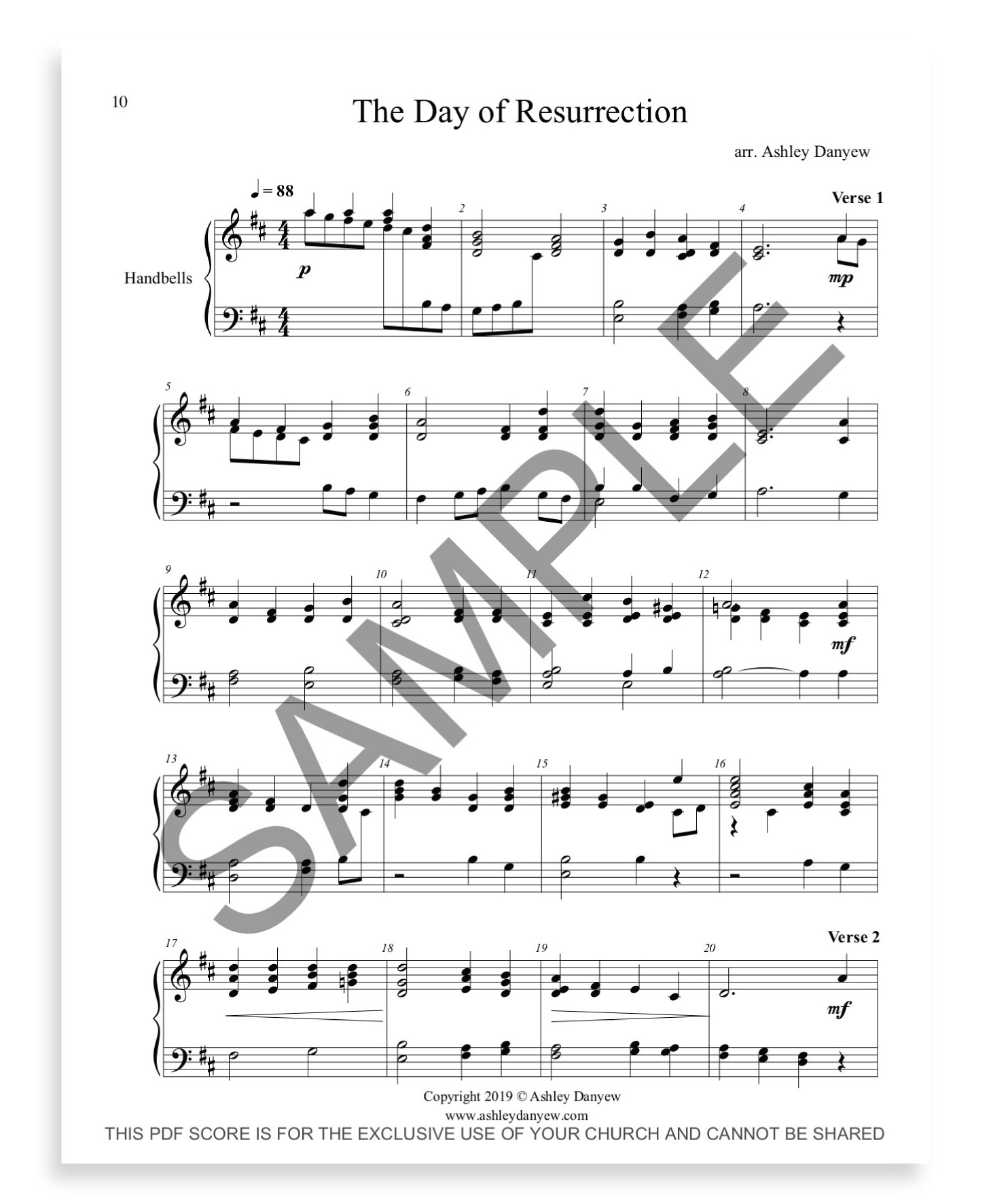 The fanfare (13 bells) is written in C major and designed to lead right into the hymn introduction. It is accessible for a beginning handbell choir with as few as seven members. The descant (21 bells) works well on one of the middle verses (so your sopranos can still have their descant on the last verse).