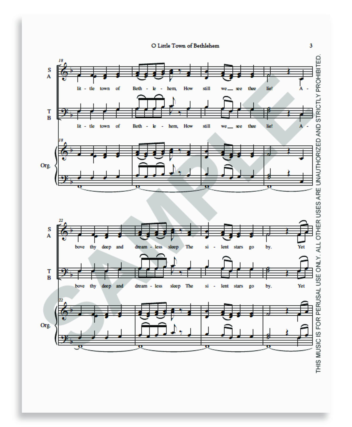 A new setting of the traditional Christmas carol, "O Little Town of Bethlehem" (FOREST GREEN), arranged for SATB choir and congregation with organ accompaniment and optional string quartet (