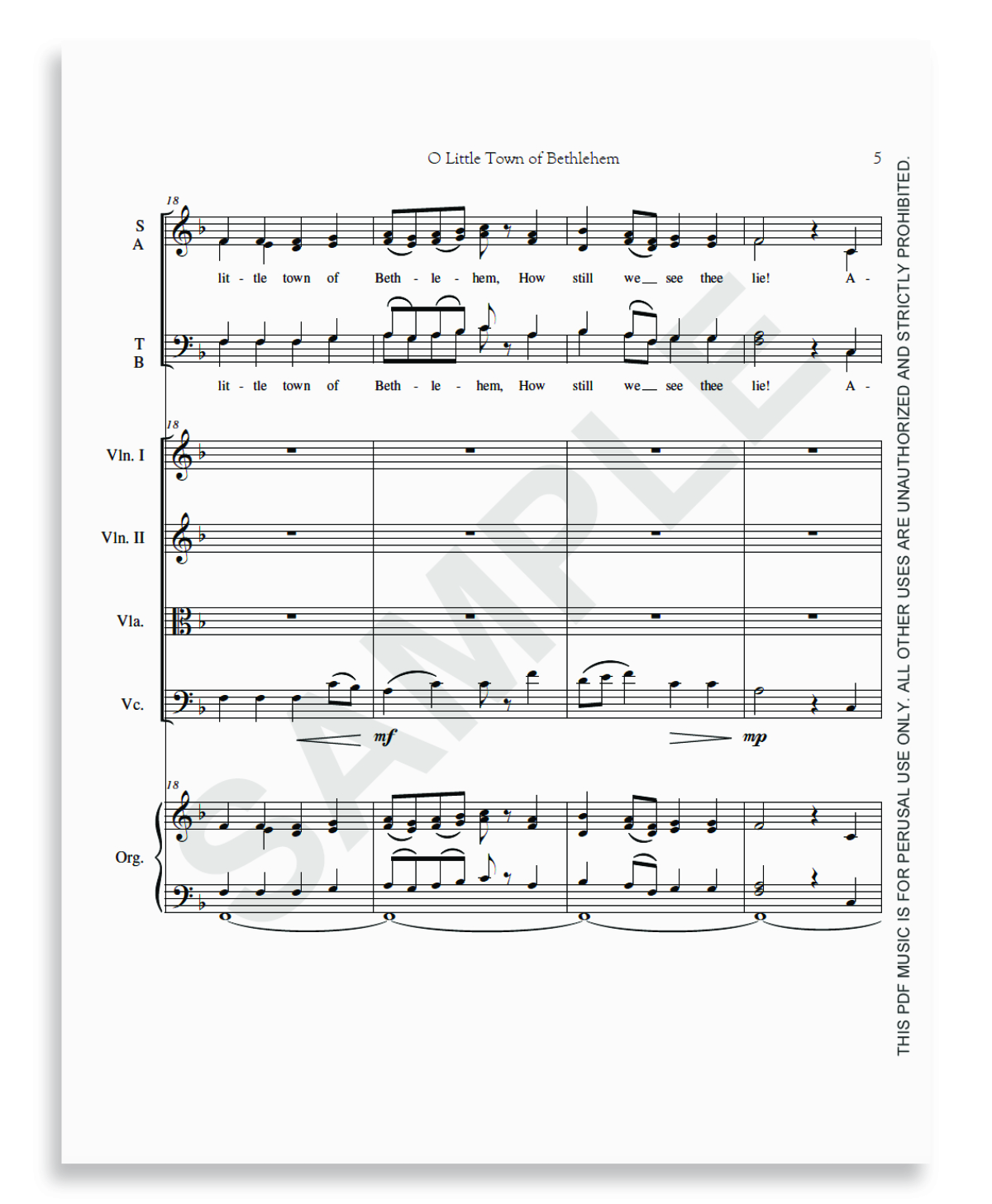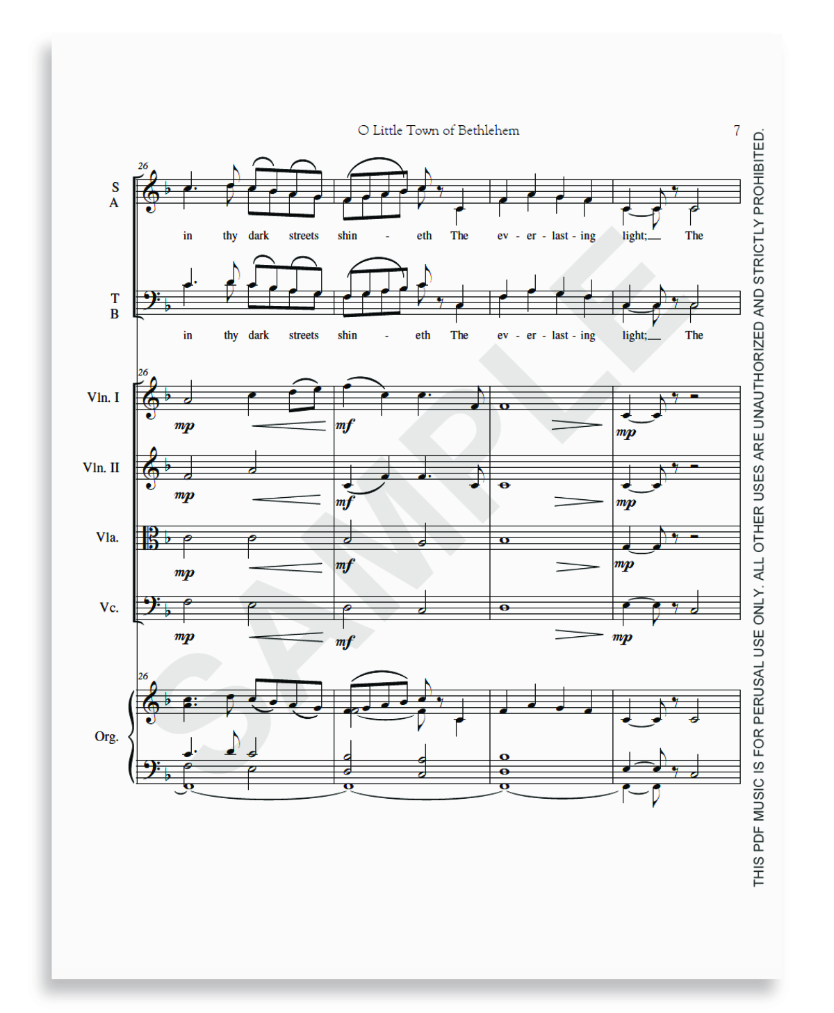 A new setting of the traditional Christmas carol, "O Little Town of Bethlehem" (FOREST GREEN), arranged for SATB choir and congregation with organ accompaniment and string quartet.