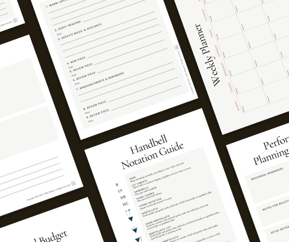 Introducing the Handbell Choir Digital Planning Kit: a 22-page collection of printables, templates, and worksheets—everything from rehearsal-planning tools to budget worksheets and performance planning to handbell notation guides.