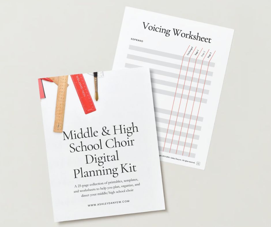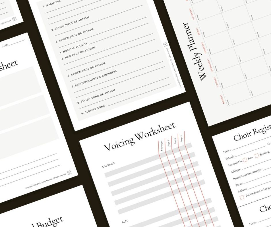 A 25-page collection of printables, templates, and worksheets (available as a printable PDF + editable Canva file) to help you plan, organize, and direct your middle/high school choir