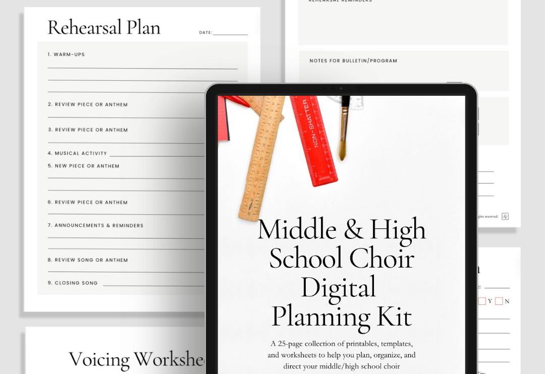 25 pages of printables, templates, and worksheets (available as a printable PDF or editable Canva file) to help you get organized, plan + direct your middle/high school choir